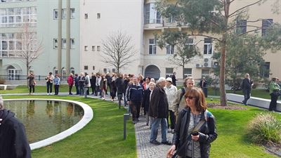 Pak jsme pokračovali ulicí Na Florenci, jejíž jednu stranu, kde je Masarykovo nádraží, možná brzy vyplní dle mého názoru poněkud předimenzované stavby Zahy Hadidové. Naproti stojí funkcionalistický palác Ferra od Kotěrova žáka Josefa Karla Říhy. Vedle je zadní dům Legiobanky (Gočár) a pak na místě někdejší Novákovy galerie (A. Wiehl), zbořené komunisty a nahrazené komplexem Rudého práva, dnes stojí administrativní centrum Florentinum arch. Ciglera a Maraniho. Prošli jsme novou pasáží a prohlédli si nádvoří i obnovenou zahradu Desfourského paláce s rybníčkem.