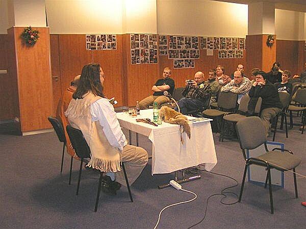 J. W. Procházka v nádherné kožené vestě s třásněmi a na hlavě s kožešinou