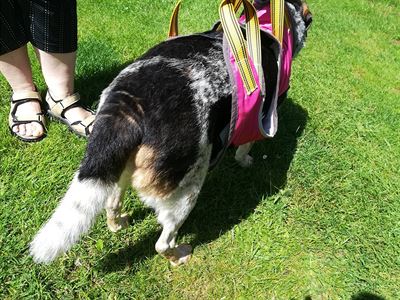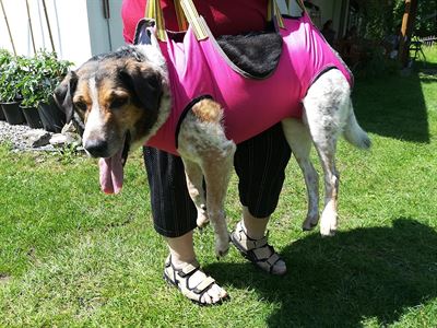 V zimě, když jí packy klouzaly po ledu a zapadala do sněhu, navíc ztuhlé klouby ji asi bolely, se mi tohle nosítko náramně osvědčilo. Ráno venčím s kamarádkou a jejím psem, tudíž jsem na čubiznu rozplesklou na ledu nebyla sama. Každá jsme popadla držadlo, čubičku jsme vytáhly ze sněhu a ledu, poponesly na lepší terén a šlo se dál.