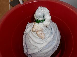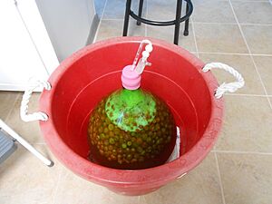 Jenže, když jsem se tu sobotu šla o dvě hodiny později na víno podívat, nestačila jsem se divit. Baňka s přichyceným balónkem byla venku a z hrdla lahve vytékala pěnová láva. Kvasná síla balónek i s baňkou vyrazila, ale naštěstí nerozbila. Přes okraj kbelíku jsem měla položený ručník, po kterém vystřelená baňka sklouzla dovnitř. Všechna vybublaná pěna zůstala v kbelíku a já zpětně děkovala osvícení mysli, abych demižon posadila do kbelíku a ne jen na igelitový ubrus na zem, jako tomu bylo dříve.