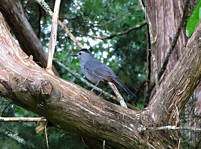 Druhý drozd – drozd šedohlavý (catbird) má podobné tóny jako mockingbird, jen jednotlivé „sady“ střídá rychleji. Často zpěv proloží krátkým „mňouknutím“, nebo jen samostatně mňouká. Podobně, jako u návratu rorýsů do komína, se každé jaro zaraduji, když se i tenhle drozd vrátí k nám. Nejprve ho v keřích jen zaslechnu, později i zahlédnu. Pak vysedává vysoko ve větvích, kde ho díky šedé barvě není snadné najít. Když si chci jeho zpěv nahrát, div si nevykroutím zakloněný krk, abych ho vůbec našla.