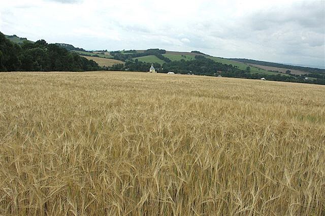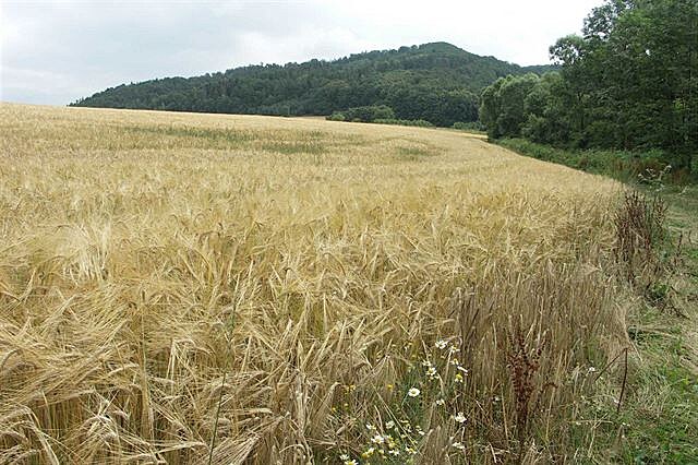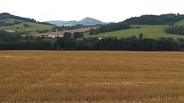 Přední Babí hora (586 m n.m.), kříž uprostřed v pozadí na kraji lesa.