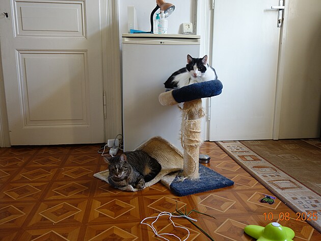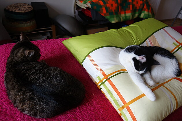 V pondělí jsme tu měli článek o sžívání lapinkoiry a špice, tak dnes si dáme sžívání pruhatce a černobíla. Černobílý Čendík oslavil devět let (asi), pruhatý Karlík bude mít někdy za pár měsíců tři (asi). Spolu jsou u nás od léta 2024.