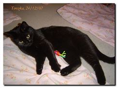 Přibližně k Adélovým patnáctým a Scottyho pátým narozeninám přibylo do naší rodiny ještě jedno zvířátko. Dcera Lucka donesla drobnou, černou, krátkosrstou, půlroční kočičku Terezku, a to i se vším vybavením, které si pro kotě lidé pořizují – pelíškem, přepravkou, hračkami, miskami, záchůdkem. Původní majitelé ji odložili, kočička prý měla neustálé problémy s průjmem.
