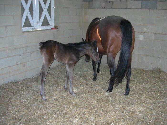Dovolila jsem si nakouknout.Roztomilé koňátko, tak jako jsou všechna. Ale té práce a starostí! Vyjížďky na mamině nestojí za nic, protože pobíhající a poskakující mládě na klidu nepřidá. Tu se napije z kaluže (a potom má průjem), tu se do cesty připlete překážka a je nutné hříbě upoutat na vodítko a opatrně jej provést kolem nebo přejít komunikaci. Jak už to potom šlo, nechávala jsem jej doma v boxu. Ale zpočátku to bylo na ucpávky do uší, toho řehotu jak od hříběte tak od mámy, když se měli od sebe na chvíli odloučit