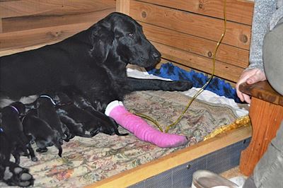 Obě holky zabřezly a vše vypadalo normálně. Derča porodila 11. 2. 2017 devět pěkných zdravých štěňat. Večer se narodilo desáté, také zdravé, ale po velmi dlouhé pauze. Ráno jsme jeli na kontrolní ultrazvuk a k našemu zděšení tam bylo ještě jedno mrtvé štěně. Po injekci ho porodila, ale už měla horečku a rozvinula se infekce dělohy. Navíc nám druhý den odpoledne začalo vypadat špatně jedno štěně a do večera uhynulo.