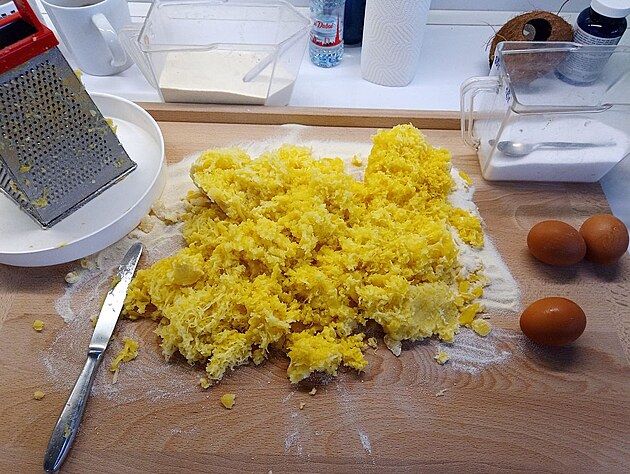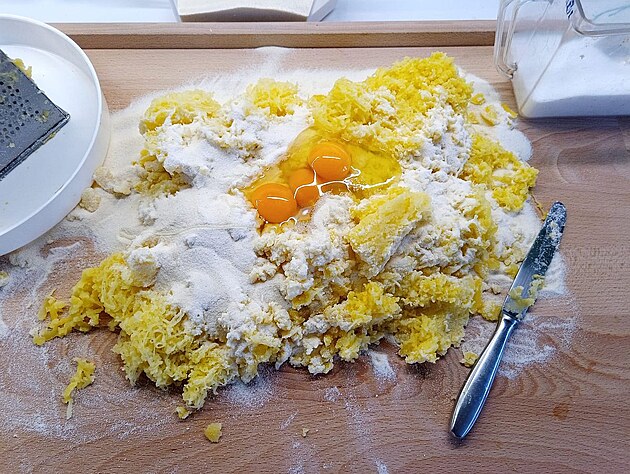 Na vál nasypu hrubou mouku, lehce osolím a na křenové straně struhadla strouhám bramboru po bramboře pěkně dokola. Zbytek brambory klidně procpu hrubou stranou struhadla. My totiž máme rádi, když jsou v bramborových knedlíkách kousíčky brambor. Nastrouhané posypu další moukou, rozklepnu do důlku vajíčka a na hrubo zpracuji nožem.