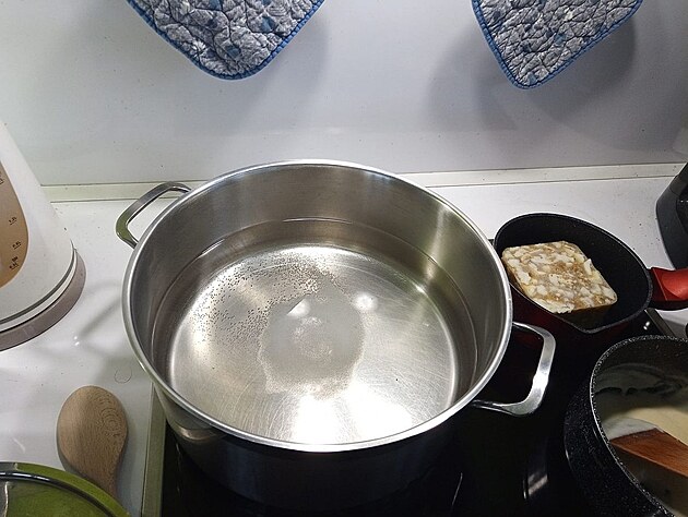 Začínám postavením správného rendlíku (velkého) s osolenou vodou na sporák, kterou hned začínám vařit.