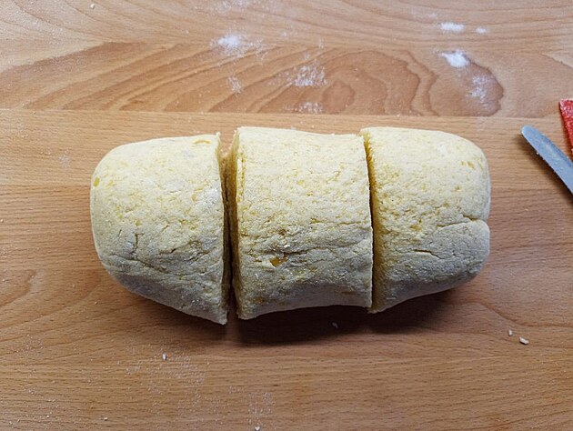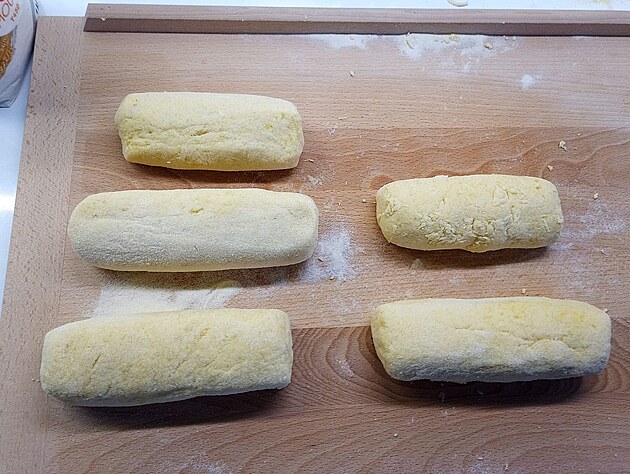 Následuje ruční propracování za dalšího přidávání mouky, až se mi hmota zdá tak akorát. Není moc tuhá, knedlíky podle mě mají být nadýchané, žádný obušek :-). Utvořím válec, rozdělím na tři díly a vyválím válečky o průměru cca 8 cm. Délka tak akorát, aby se po uvaření vešly do knedlíkového kráječe.Tentokrát jsem měla brambor 1,2 kg, tak těch válečků bylo 5 a největší rendlík, který mám, je na 10 litrů.