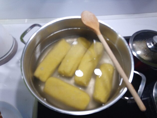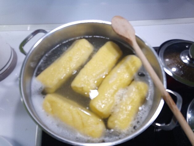 Válečky dávám hned jeden po druhém vařit. Každý několikrát podeberu ode dna vařečkou, aby se nepřilepily. Doba varu je 20 minut, v polovině doby už knedlíky vyplavou k hladině a já se je pokusím ve vodě otočit. Někdy se jim nechce, nevadí to.