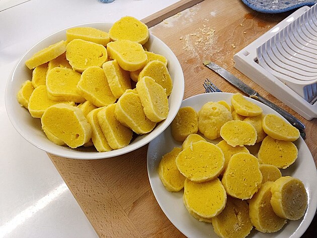 Pak je po jednom lovím, a na knedlíkovém kráječi krájím. Trvalo mi hodně let, něž jsem si kráječ koupila, a nedám na něj dopustit. Z kráječe urovnám knedlíky na mísu, přikryji fólií a nechám vychladnout.
