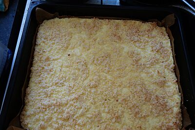 Potom přijde na řadu pekáč. Vyložila jsem si ho pečicím papírem, rozprostřela na něj těsto, na těsto rozprostřela tvarohovou náplň a navrch rozdrolila užmoulanou drobenku.