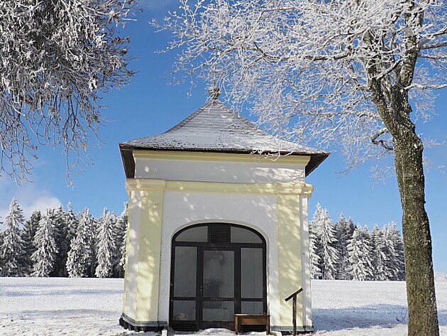 Když v Matějově přecházíme na asfalt bez sněhu, je to úleva nejen pro nohy, ale taky trochu i pro tu upadající morálku. Procházíme kolem matějovské kaple Navštívení Panny Marie z roku 1908, jejíž zlaté lemování prosvětluje bezbarvé šedivo a dodává výhledu radostný nádech.