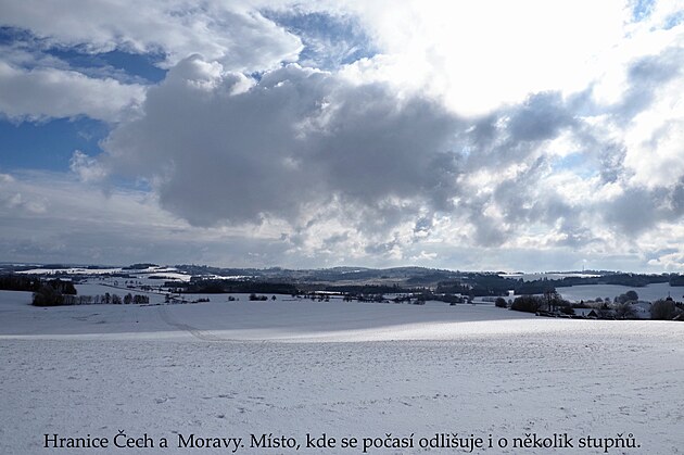 Zemská hranice Čech a Moravy u Sirákova. Místo, kde se prý dělí počasí a to často i o několik stupňů. I my jsme toho svědky. Před chvíli jsme se na sluníčku vařily a chtěly svlékat vrstvy, teď u horkého čaje sedíme zachumlané s vrstou navíc a rychle žvýkáme, aby nám svačiny nepřimrzly k patru. Hraniční kámen, restaurovaný v roce 2015, si žádá společnou fotografii.