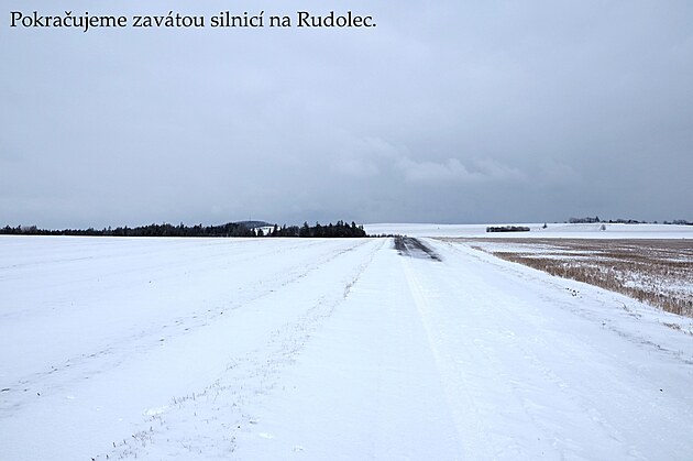 Od kaple stoupáme kolem patrového zámku, jehož historie spadá až do 15. století, v současnosti bohužel po smrti posledního majitele chátrá, přestože od kapličky u silnice je výraznou dominantou obce Rudolec, která leží jen pár desítek metrů od historické hranice Čech a Moravy, na Moravské straně.